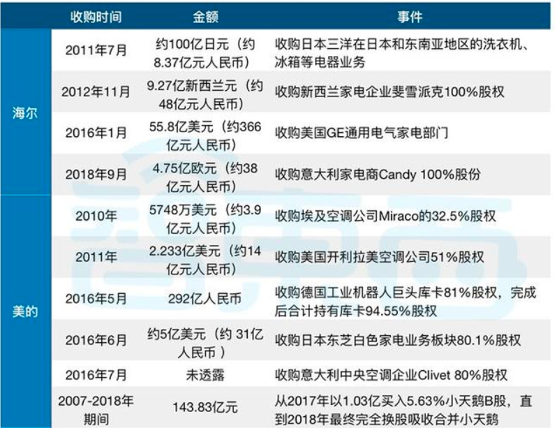 美的是奥克斯最大的“军火”供应商,后者压缩机、电机等核心零部件主要来自前者,直接规模性推升了美的垂直一体化竞争能力。  图10:2018格力/美的/奥克斯空调销量一览。 攘外必先安内,与美的十年内战,迫使格力降低了国际化战略的优先级。 【2】双刃剑 因循全球通用技术发展规律,在绝大多数步入成熟期的产业业态内,最终一揽众山小的公司都是以并购作为辅助手段不断抬升产业链位置,一如医药业的辉瑞、汽车业的大众、金融业的JP摩根、信息业的微软与谷歌…… 之于格力,强调自主研发精神固然令人钦佩,但这也是一把双刃剑,因此错过了支撑开启国际化新周期的窗口性机遇(当然,另一种观点是可能回避了国际化的未知风险)——中国入世红利。 很大程度上,得益于空调品类的利基优势与城镇化进程大势,过去较长一个时期格力基于自主知识产权的成本竞争优势如鱼得水,但在主要对手通过并购实现技术平权后,丰沛的雨季便戛然而止。 尤其在种种不确定全球宏观风险不期而遇时,格力平滑周期的能力更略显捉襟见肘。市值维护的短期预期,只落在回购一个选项上。 ▲图11:海尔/美的重要国际并购一览。来源:智东西。 目前,格力在海外共有巴西、巴基斯坦和越南三个生产基地,空调出口占比20%。反观美的,截至2019年末,海外销售占公司总销售 40%以上,其中空调出口占比30%,拥有 17 个海外生产基地,以及在包括中国在内的 11个国家设有 28 个研究中心。 通观格力发展史,并购基因短板亟待正视。过去年间,最成功的并购仅是将凌达压缩机收入麾下,以此开启了核心科技之路。此外,外界能想起的只有一地鸡毛的银隆事件。 资本并购,买的不仅是实物资产,更是技术、品牌、管理半径与跨周期能力。格力重自主研发、轻并购还有更深层次内因,外界正期待随着混改的落地与势能释放得以有效化解。