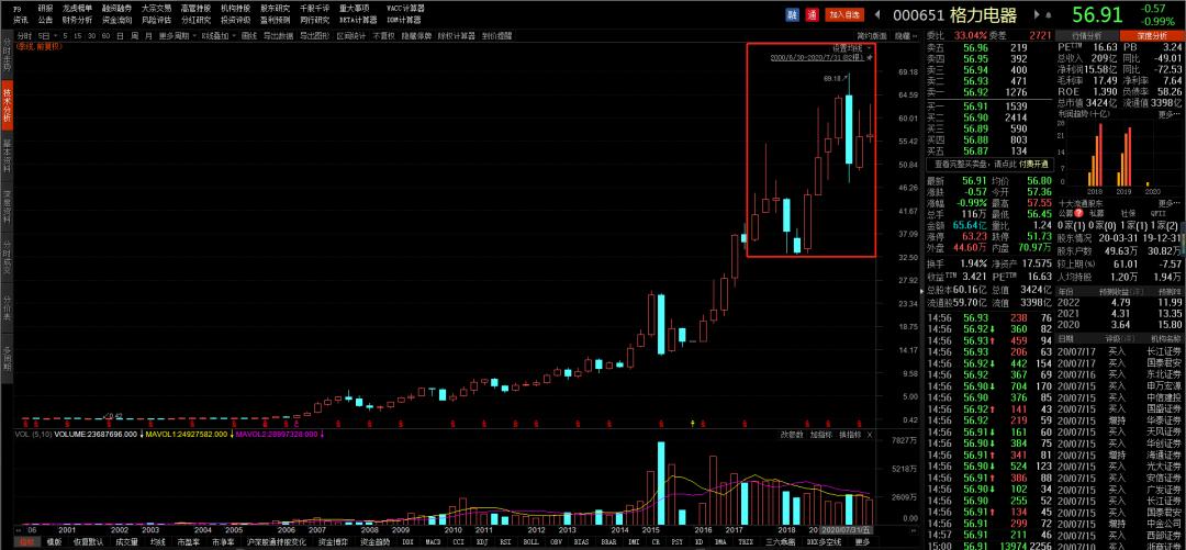 具体来说: 1. 格力的部分高端家用空调及商业空调压缩机外采于三菱、松下及大金等。2. 部分高端空调产品的直流电机外采于松下等。3. 格力的转子压缩机技术非常成熟,同时也掌握了螺杆及涡轮压缩机关键技术,但在后两者及离心压缩机领域还有赶超空间。4. 格力的电驱芯片模块仍处于自产替代的初期,尤其是功率半导体芯片模块仍在入门阶段。 总体而言,格力的全球专利布局超过8万件,与空调有关的专利申请接近3万件,其中中国市场获得授权的发明专利超过9000件,围绕一台空调所构建的专利壁垒几乎细致到“毛细血管”的程度。这样的竞争强度,在过去20年间使其不断抬升市场份额,长期掌握中国空调市场的定价权。 ▲图6:格力空调相关专利技术布局示意图。 基于以上事实,我们可以得到两个结论: 1.空调产品不存在竞争准入式的标准型核心科技。2.格力的“核心科技”,是指拥有自主知识产权的垂直一体化制造能力。 格力股价在3000亿上下悬停3年之久,反映在财务视角上是过去两年多来营收滞涨及净利润下滑。 ▲图7:格力股价季K图。 这种现象之下,隐含着更为深刻的信息——代入知识产权竞争视角观察,尤为清晰:因为挑战者的上位,格力空调垂直一体化制造能力在当今中国市场不再稀缺。 挑战者,自然是另一同样以风扇单品起家的家电巨头美的集团(SZ:000333)。 在全链条核心部件上拥有自主知识产权,带来的竞争优势是基于成本与质量管控的定价权。过去20余年,在挑战格力空调定价权这一课题上,美的可谓功不唐捐: ※压缩机:美芝压缩机。1999年从东芝与万家乐手中收购60%股权,如今已成为中国市占率最高的压缩机品牌。※电机:威灵电机。1992年与日本芝浦电机制作所、细田贸易株式会社合作成立,目前中国第一大空调电机品牌。※电驱模块:2014年自建IPM(智能功率模块)工厂,早于格力4年。※并购大招:2016年4.7亿美元收购东芝白电业务80.1%股权,获得超过5000件白电全球专利,一举巩固了中国空调市场垂直一体化制造能力的唯二地位。